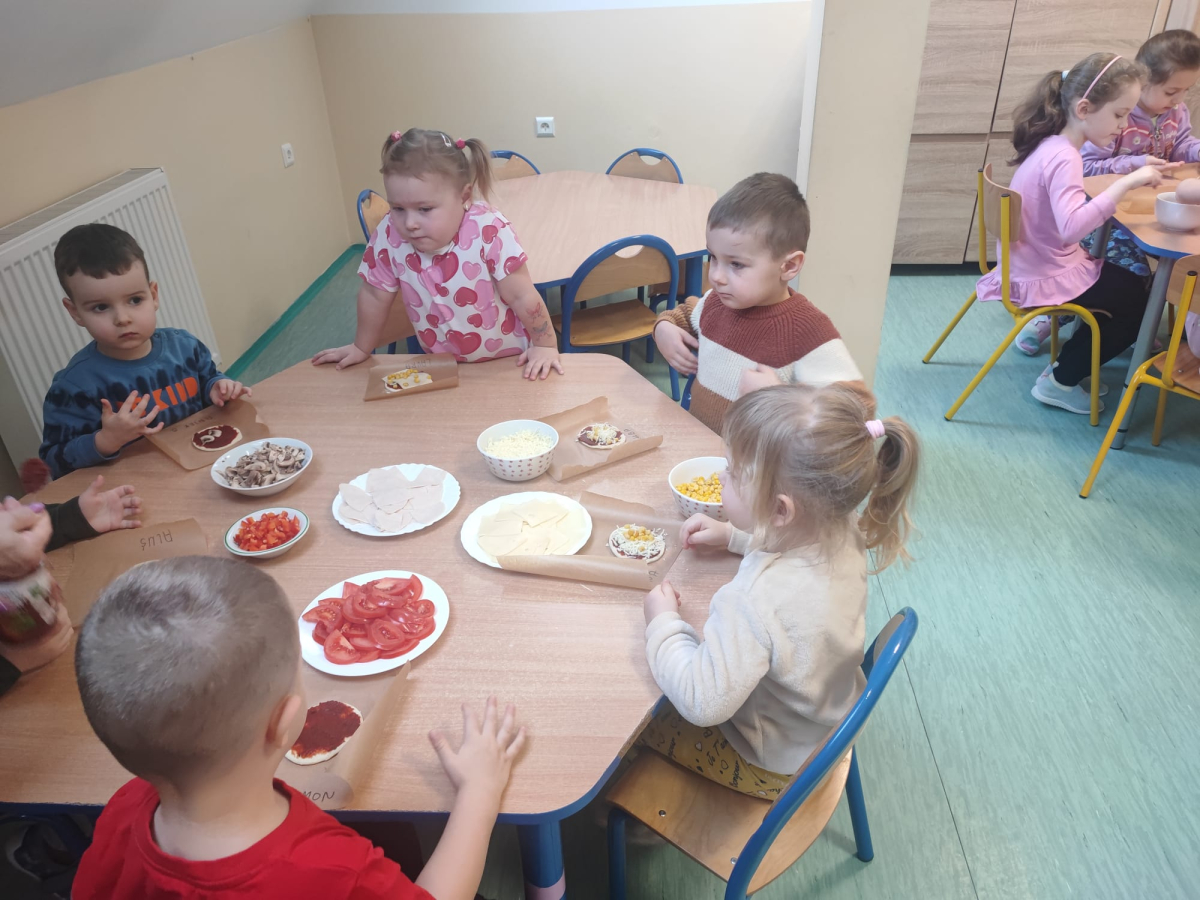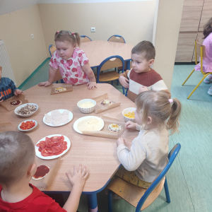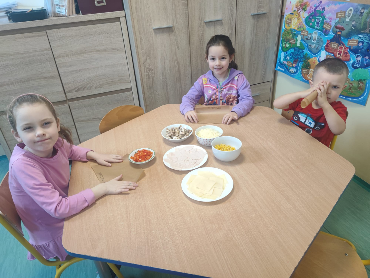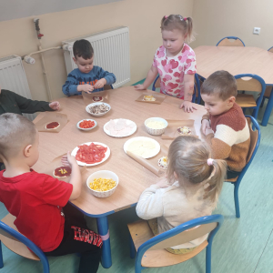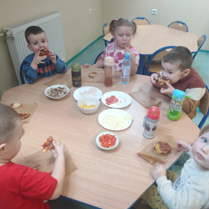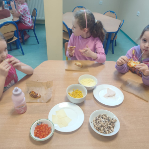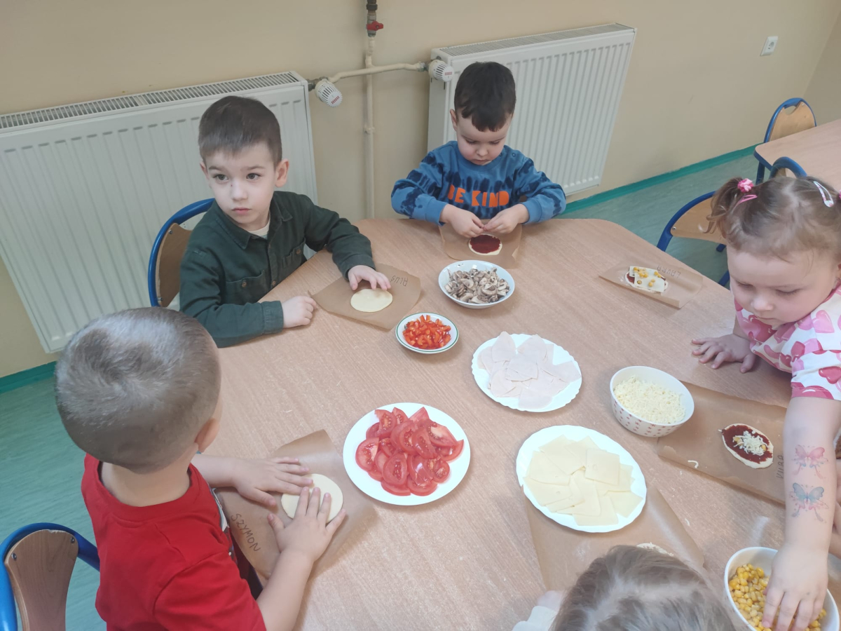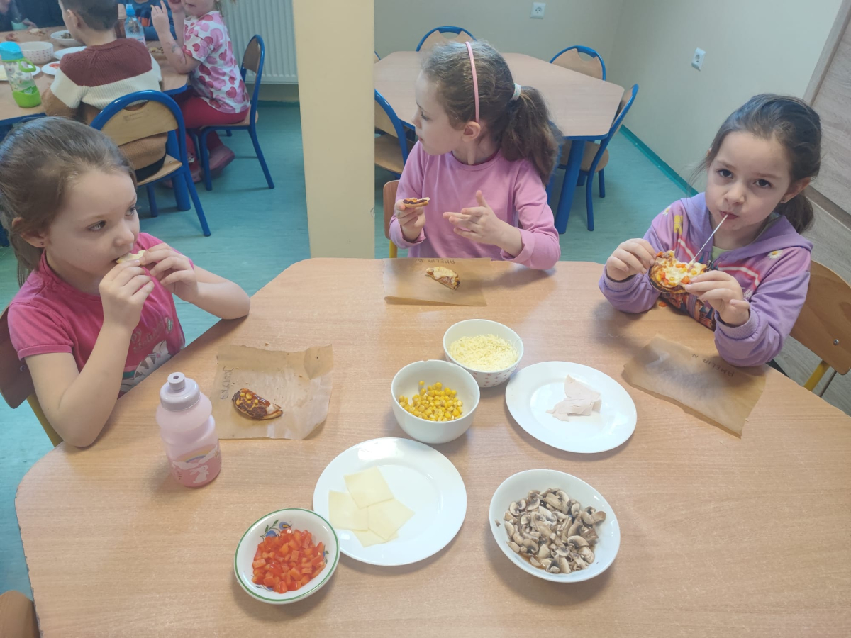 "Pszczółki" stworzyły w swojej sali malutką pizzerię. Wspólnymi siłami mieszały składniki, zagniatały ciasto a następnie czekały aż wyrośnie. Gdy ciasto było już gotowe przyszła kolej na wybieranie składników i komponowanie swojej pizzy a potem degustacje.