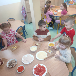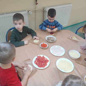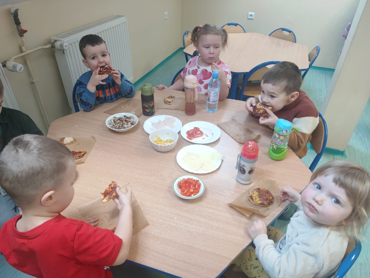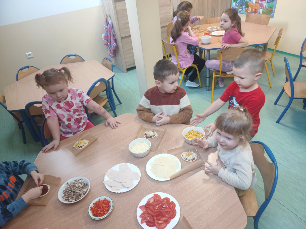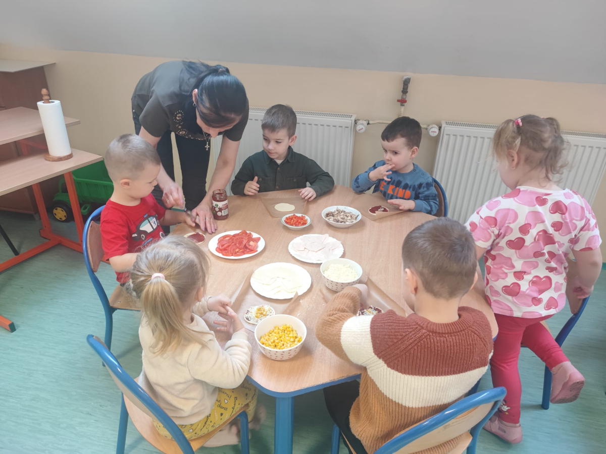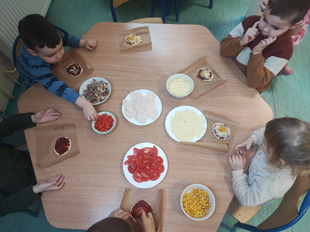 "Pszczółki" stworzyły w swojej sali malutką pizzerię. Wspólnymi siłami mieszały składniki, zagniatały ciasto a następnie czekały aż wyrośnie. Gdy ciasto było już gotowe przyszła kolej na wybieranie składników i komponowanie swojej pizzy a potem degustacje.