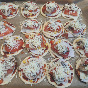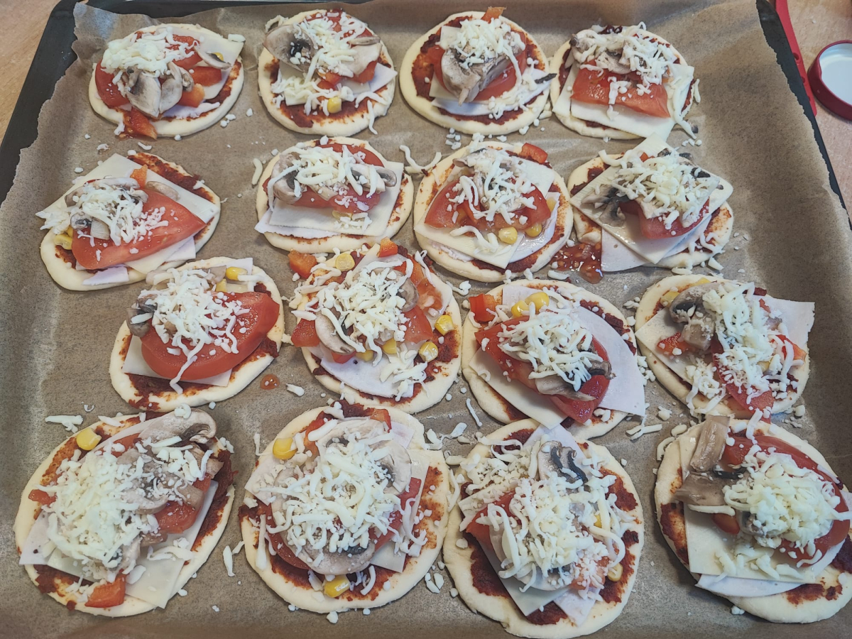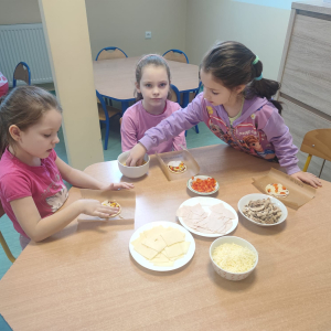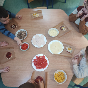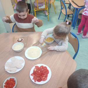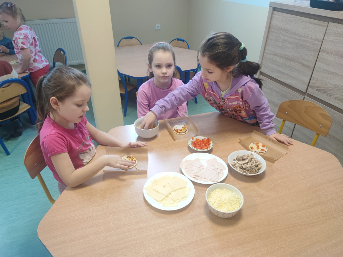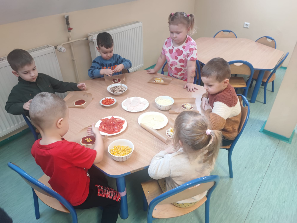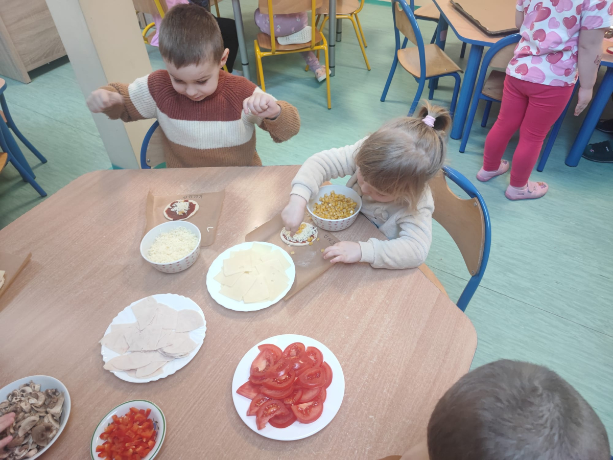 "Pszczółki" stworzyły w swojej sali malutką pizzerię. Wspólnymi siłami mieszały składniki, zagniatały ciasto a następnie czekały aż wyrośnie. Gdy ciasto było już gotowe przyszła kolej na wybieranie składników i komponowanie swojej pizzy a potem degustacje.
