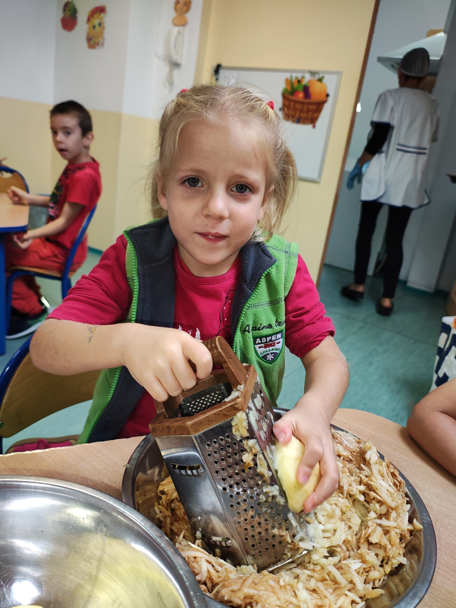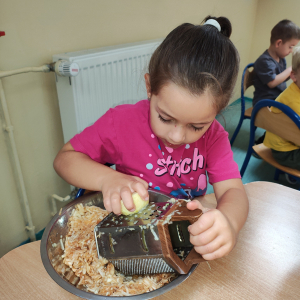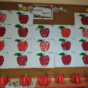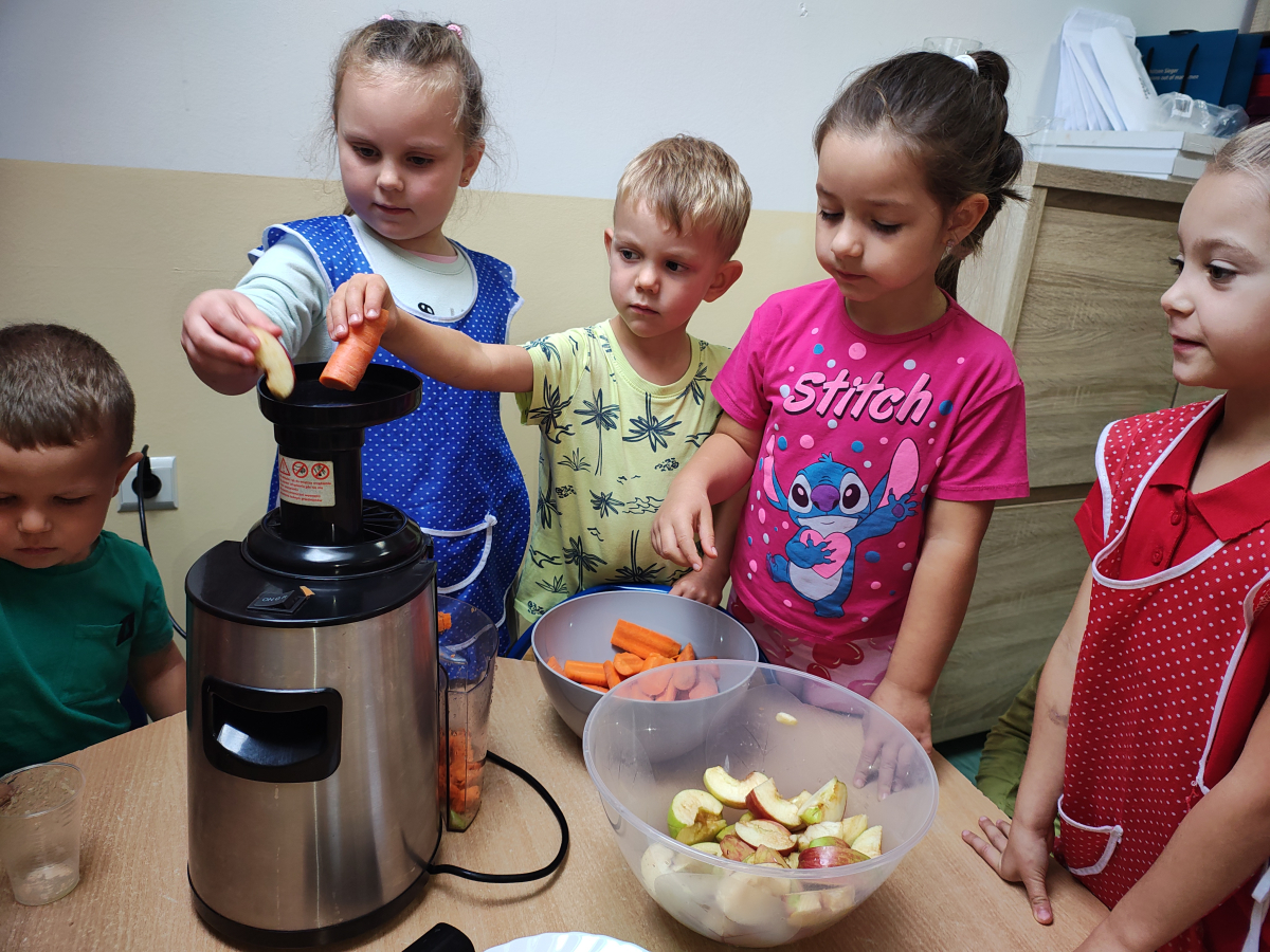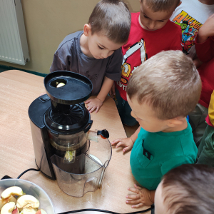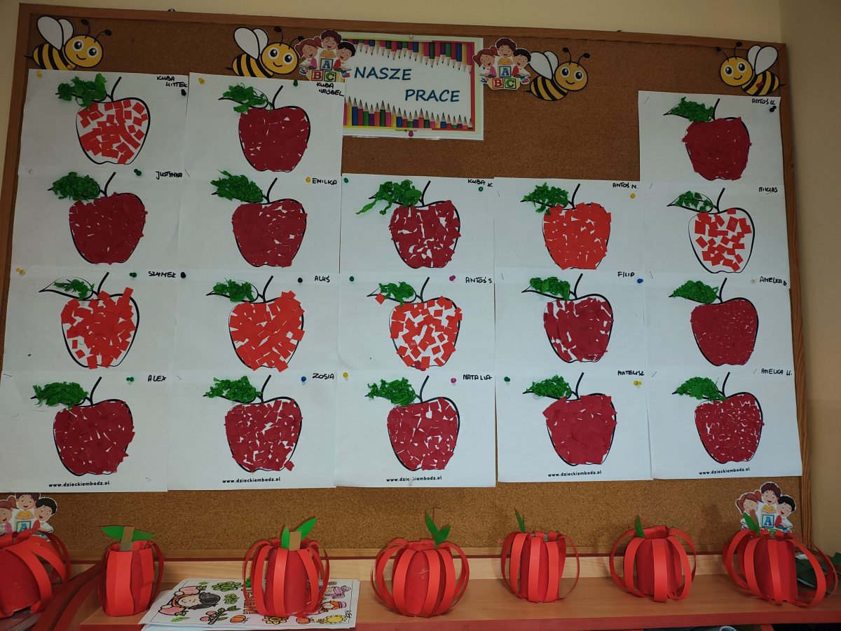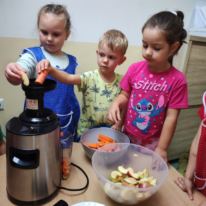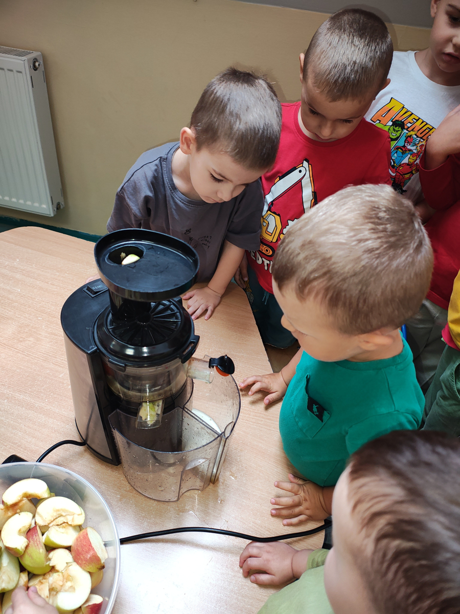 Od rana dzieci pracowały z pełnym zaangażowaniem podczas tarcia i wykładania jabłek i ciasta, robienia soku z jabłek i marchewki a także podczas pracy plastycznej - oczywiście z jabłkami w roli głównej. Małe rączki ćwiczyły w wielu aktywnościach. Ale poza pracą każdy miał okazję posmakować własnoręcznie zrobionego soku i szarlotki. Było pysznie, pachnąco i kolorowo.