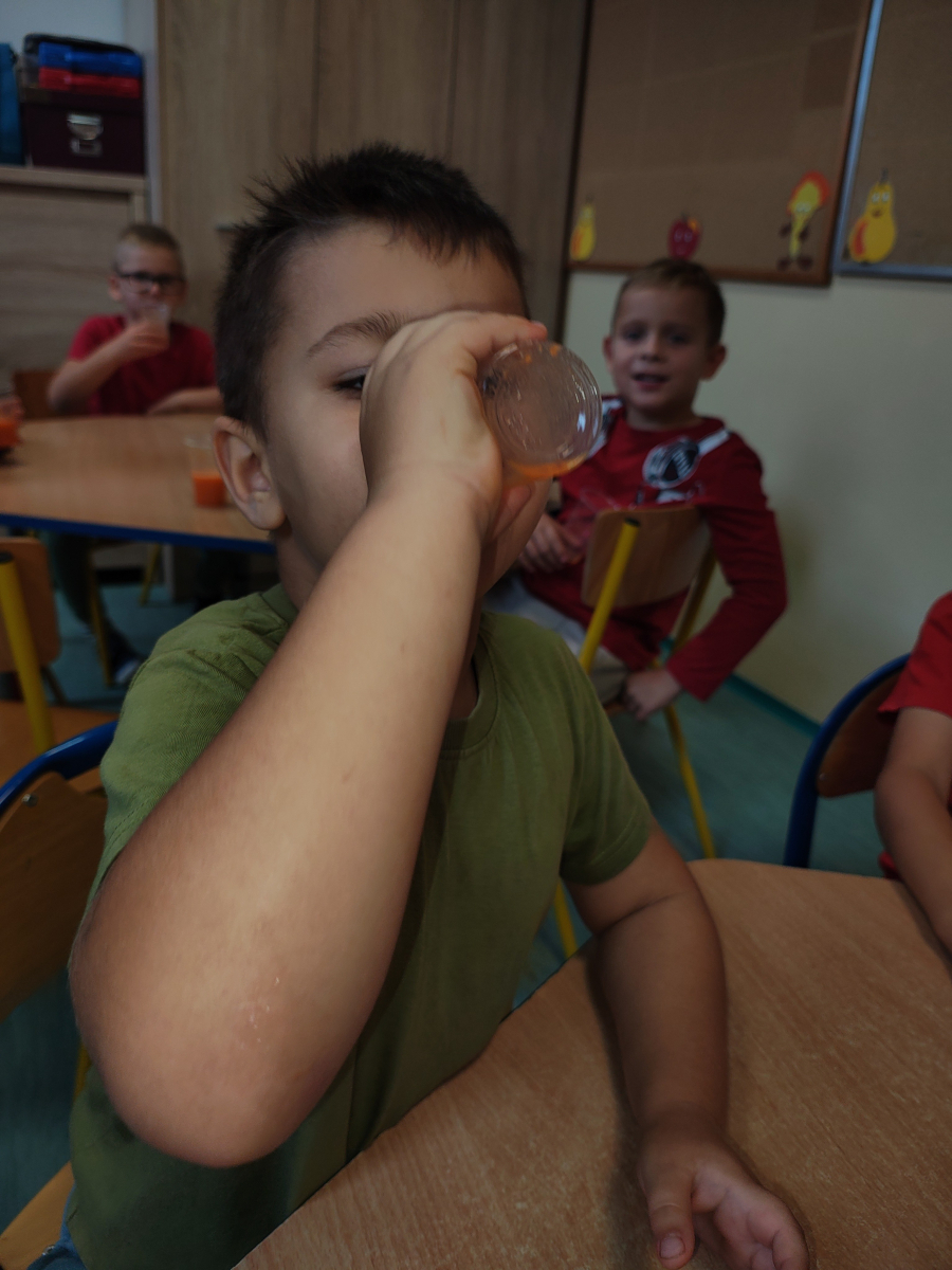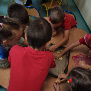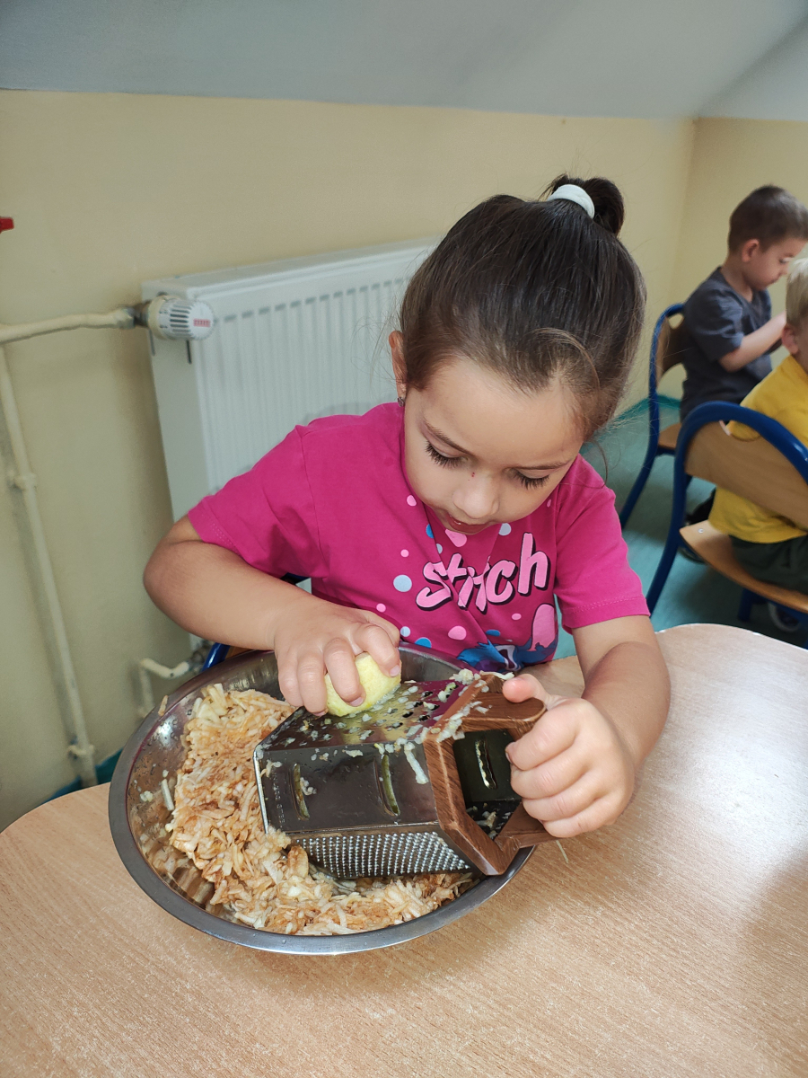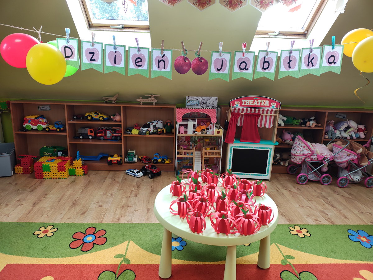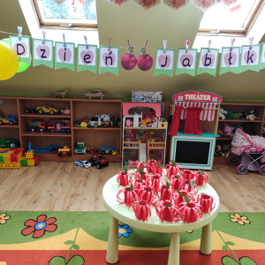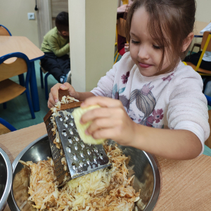 Od rana dzieci pracowały z pełnym zaangażowaniem podczas tarcia i wykładania jabłek i ciasta, robienia soku z jabłek i marchewki a także podczas pracy plastycznej - oczywiście z jabłkami w roli głównej. Małe rączki ćwiczyły w wielu aktywnościach. Ale poza pracą każdy miał okazję posmakować własnoręcznie zrobionego soku i szarlotki. Było pysznie, pachnąco i kolorowo.