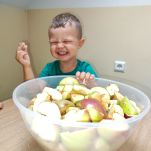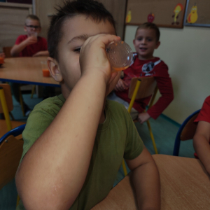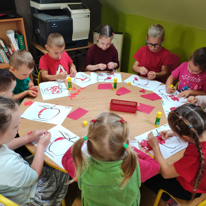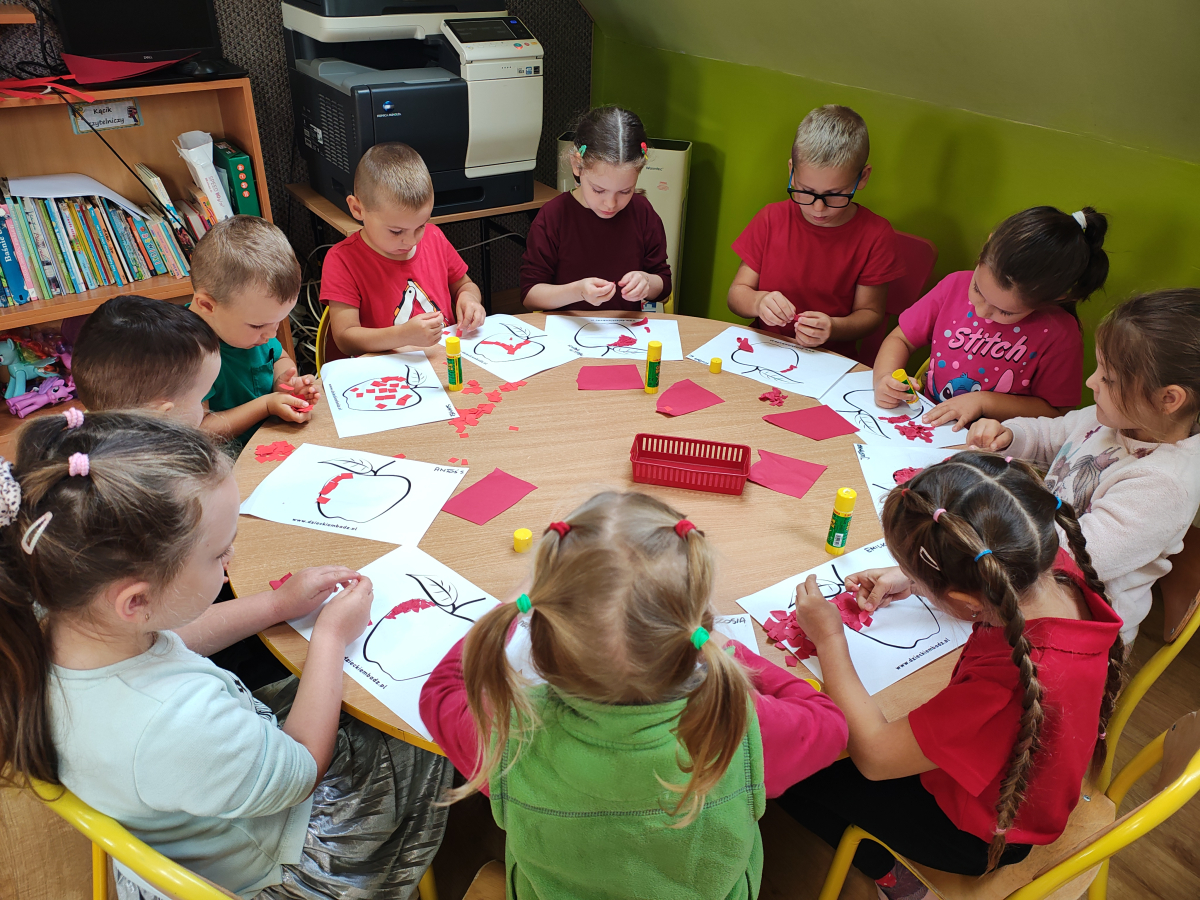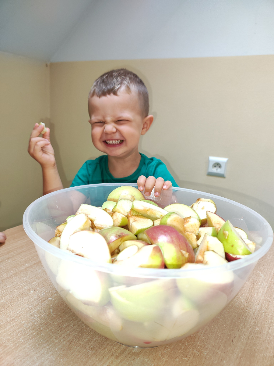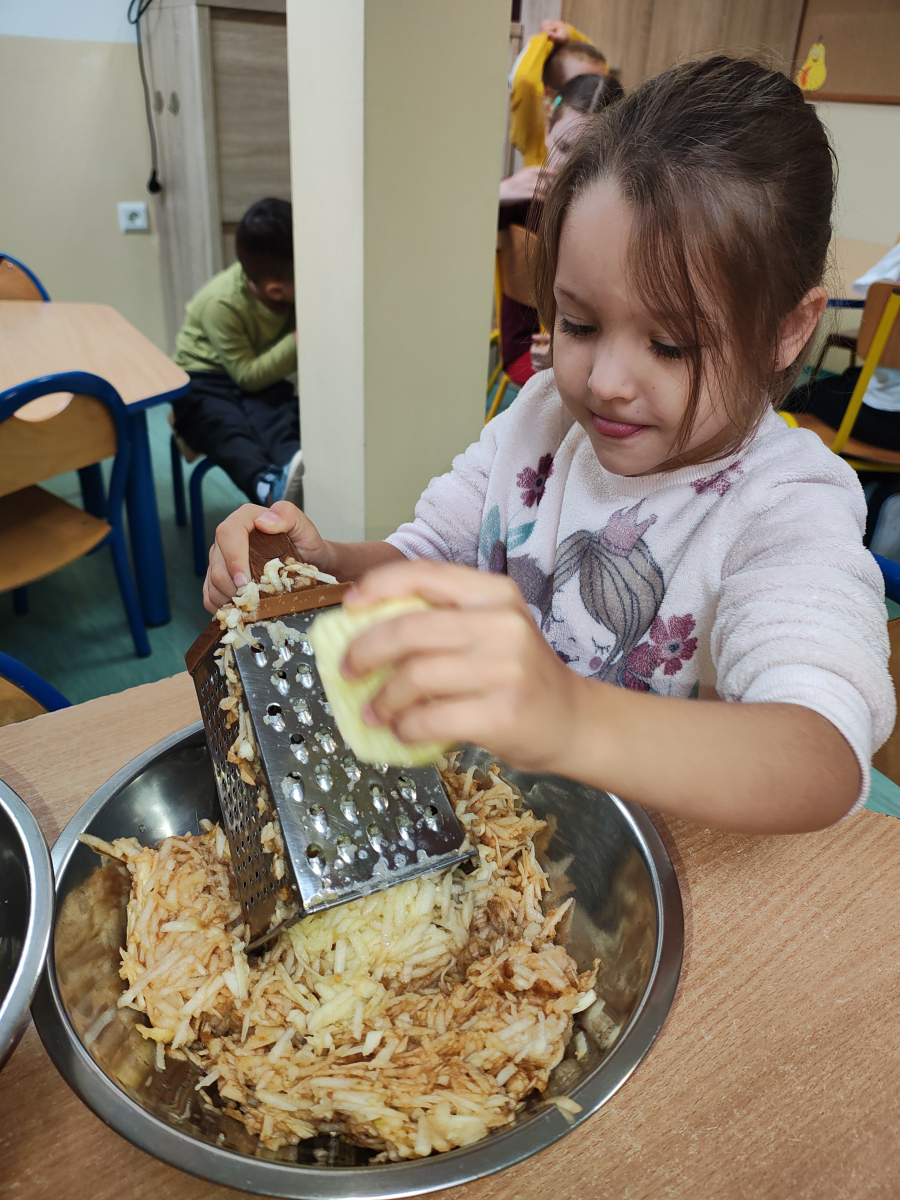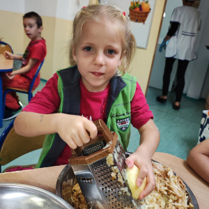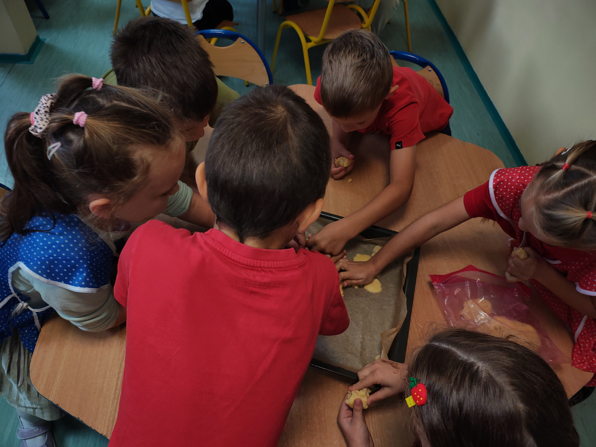 Od rana dzieci pracowały z pełnym zaangażowaniem podczas tarcia i wykładania jabłek i ciasta, robienia soku z jabłek i marchewki a także podczas pracy plastycznej - oczywiście z jabłkami w roli głównej. Małe rączki ćwiczyły w wielu aktywnościach. Ale poza pracą każdy miał okazję posmakować własnoręcznie zrobionego soku i szarlotki. Było pysznie, pachnąco i kolorowo.