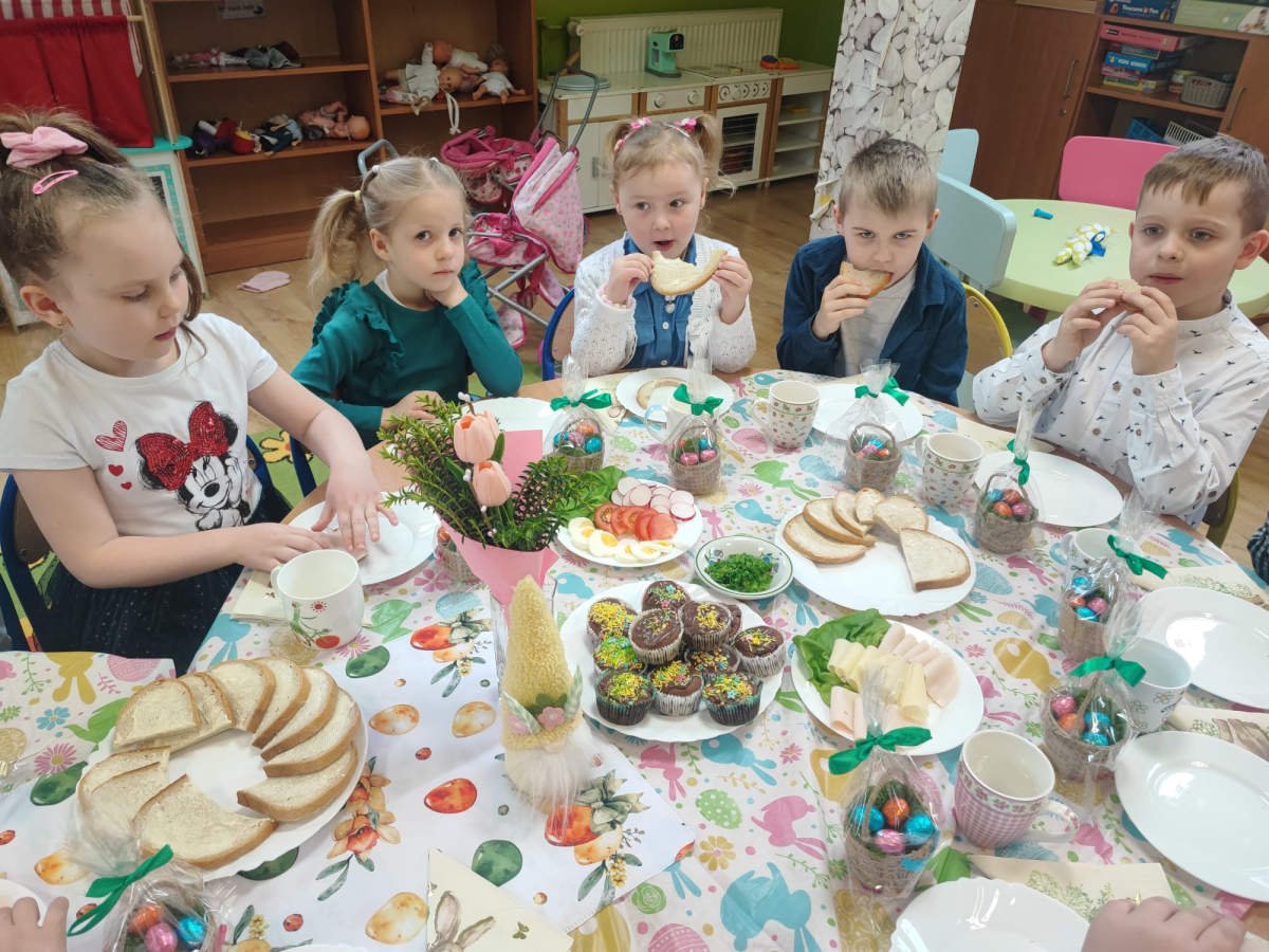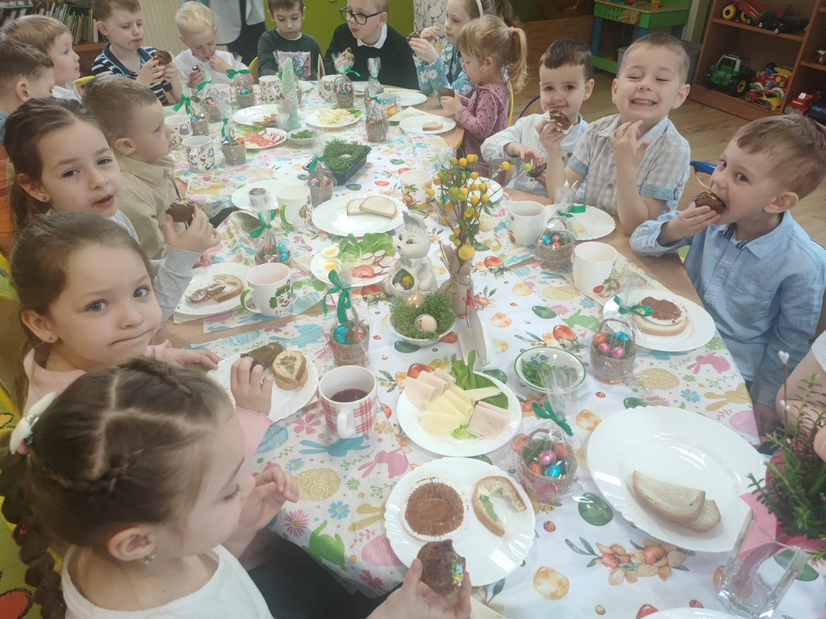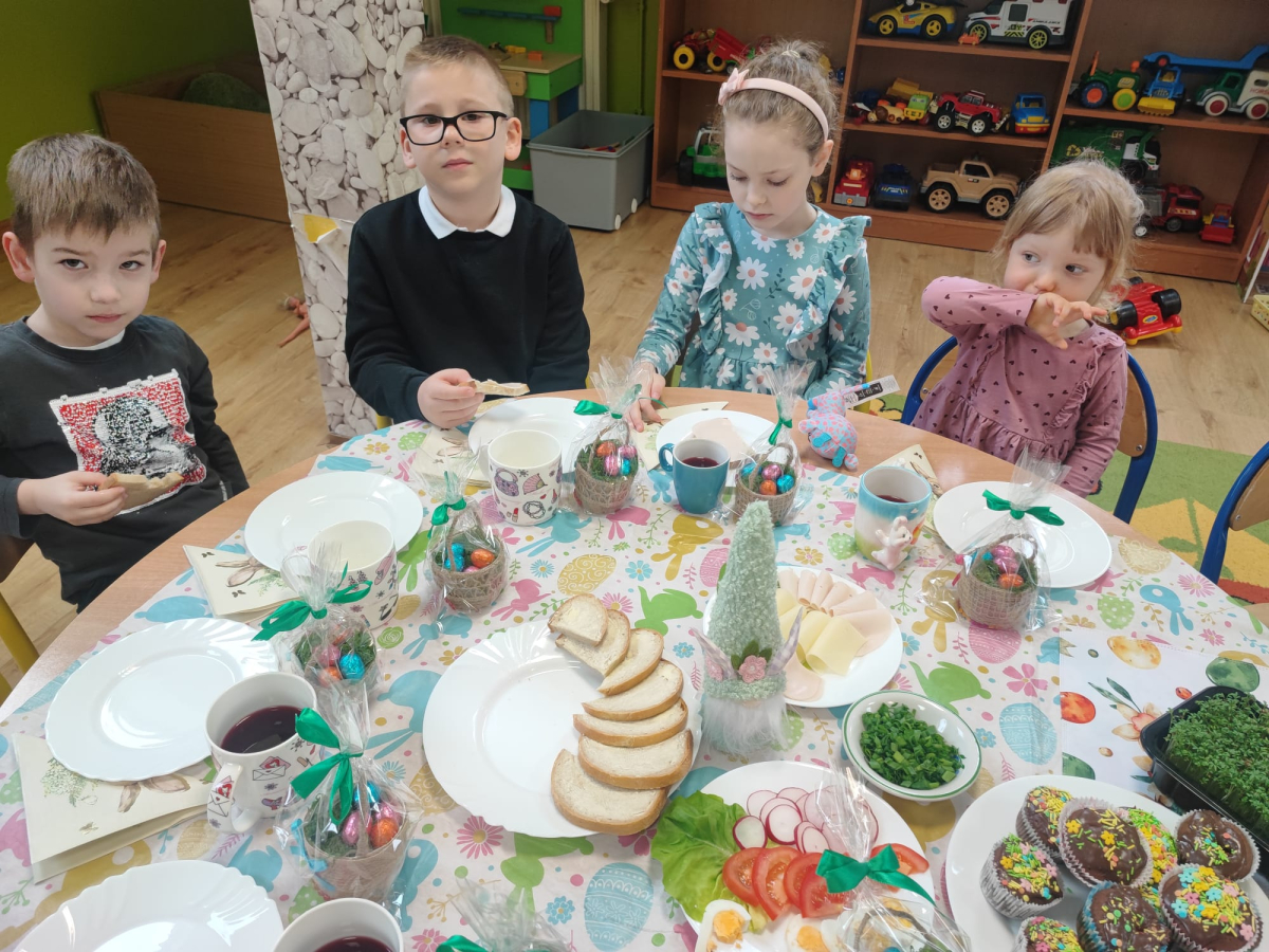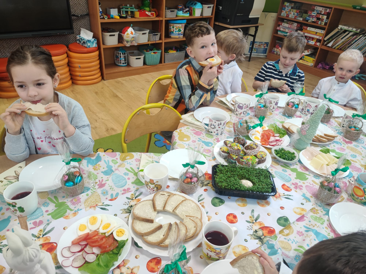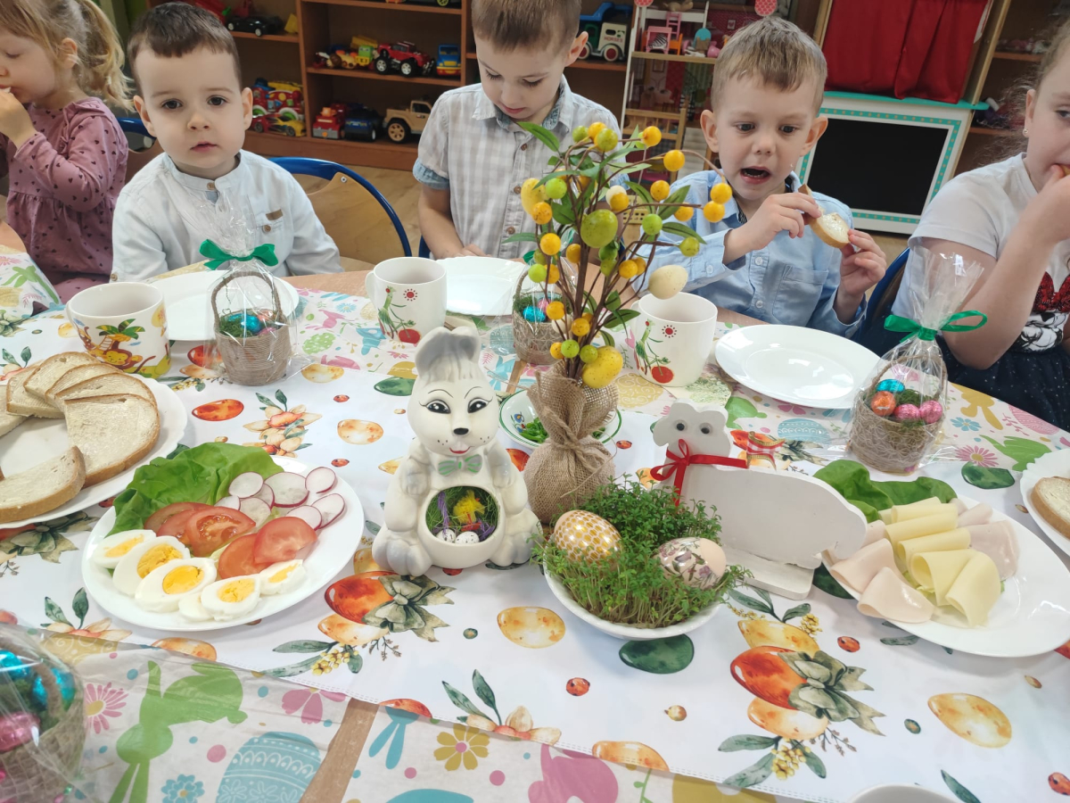 Dziś w naszym przedszkolu odbyło się uroczyste Śniadanie Wielkanocne. Na świątecznym stole nie mogło zabraknąć jajka, szyneczki, rzodkiewki i innych smakołyków. Śniadanko zostało rozpoczęte wspólnym składaniem sobie życzeń świątecznych następnie zasiedliśmy do pięknego stołu zastawionego pokarmami Wielkanocnymi. Ten dzień miał wyjątkowy charakter, dzieci śpiewały piosenki świąteczne i bawiły się w zabawy związane z tradycjami Wielkanocnymi. Po śniadaniu szukaliśmy zajączka, który schował w sali przedszkolnej upominki dla dzieci. Spotkanie przy wspólnym świątecznym stole sprawiło dzieciom wiele radości.