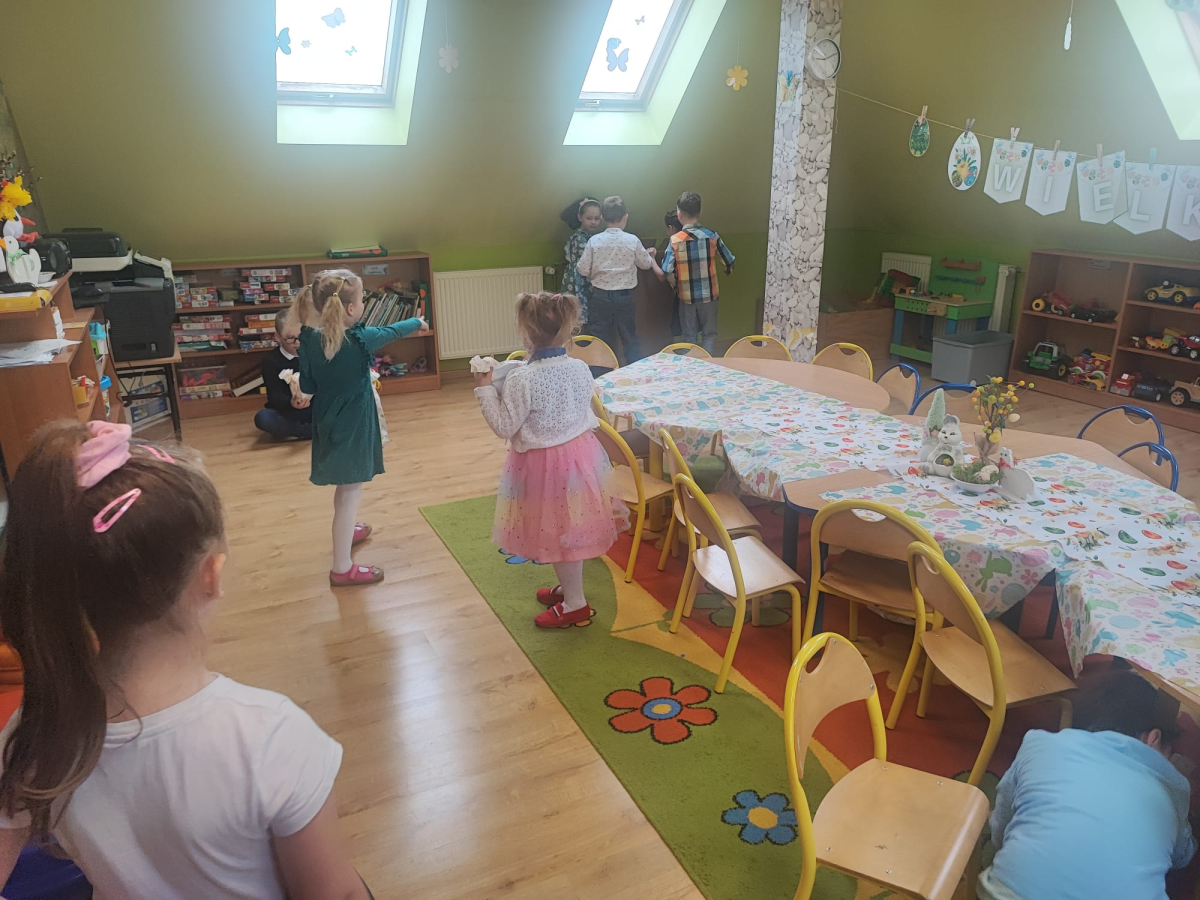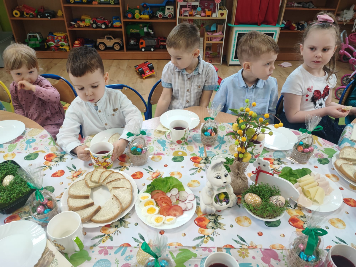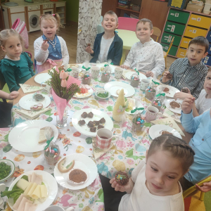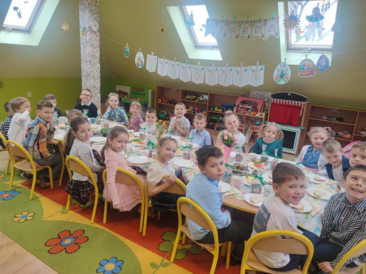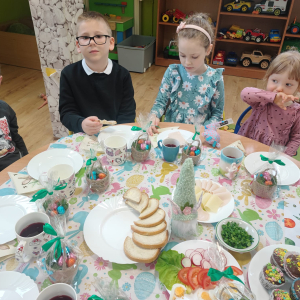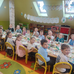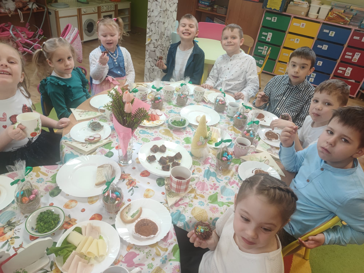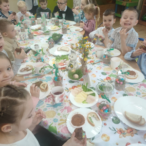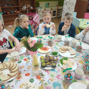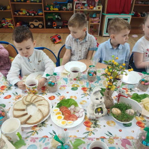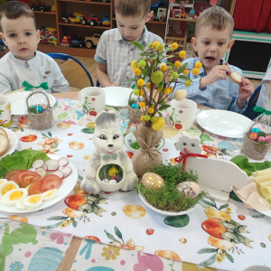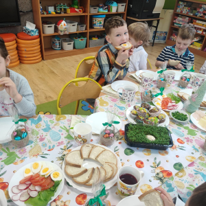 Dziś w naszym przedszkolu odbyło się uroczyste Śniadanie Wielkanocne. Na świątecznym stole nie mogło zabraknąć jajka, szyneczki, rzodkiewki i innych smakołyków. Śniadanko zostało rozpoczęte wspólnym składaniem sobie życzeń świątecznych następnie zasiedliśmy do pięknego stołu zastawionego pokarmami Wielkanocnymi. Ten dzień miał wyjątkowy charakter, dzieci śpiewały piosenki świąteczne i bawiły się w zabawy związane z tradycjami Wielkanocnymi. Po śniadaniu szukaliśmy zajączka, który schował w sali przedszkolnej upominki dla dzieci. Spotkanie przy wspólnym świątecznym stole sprawiło dzieciom wiele radości.