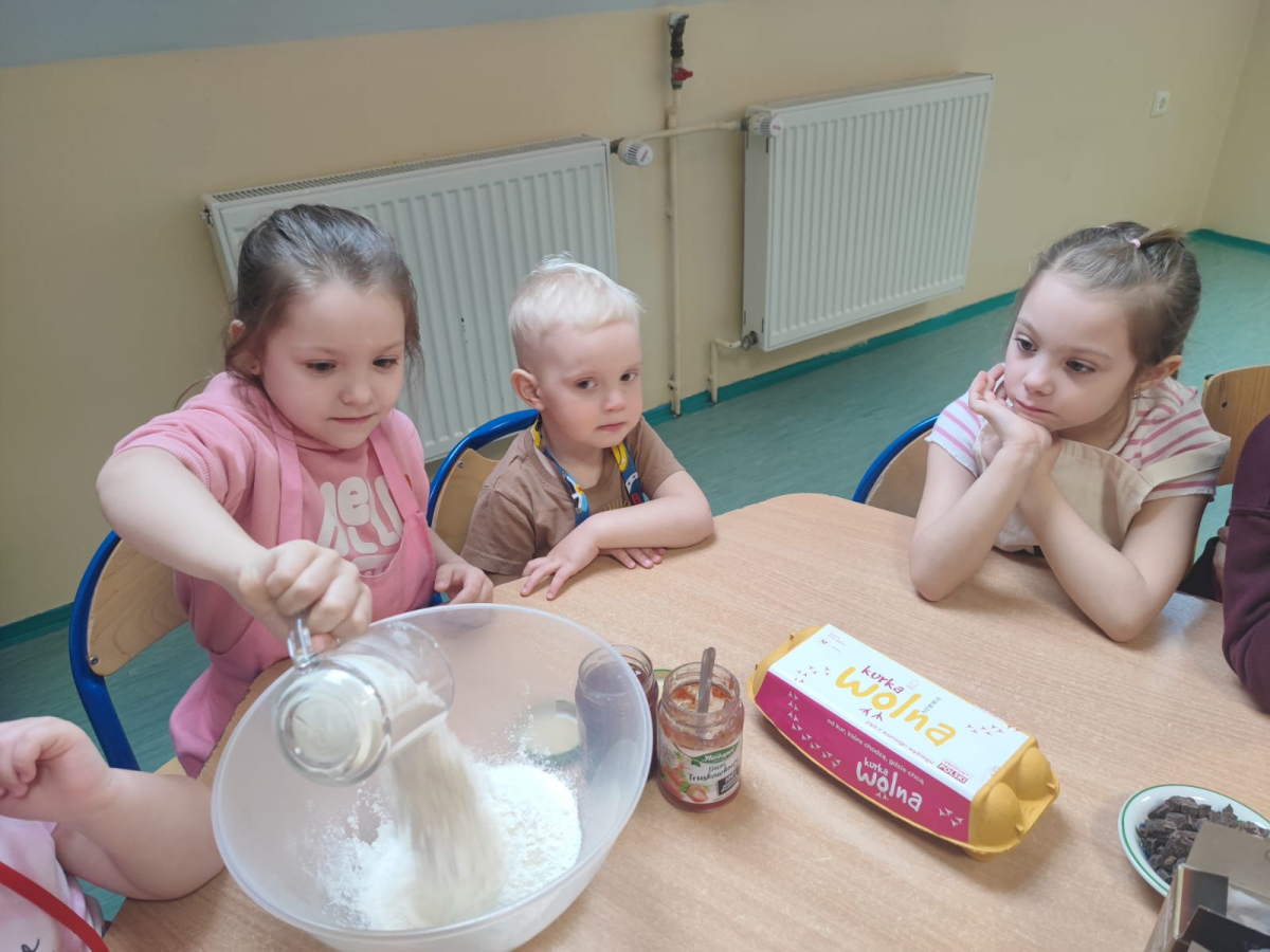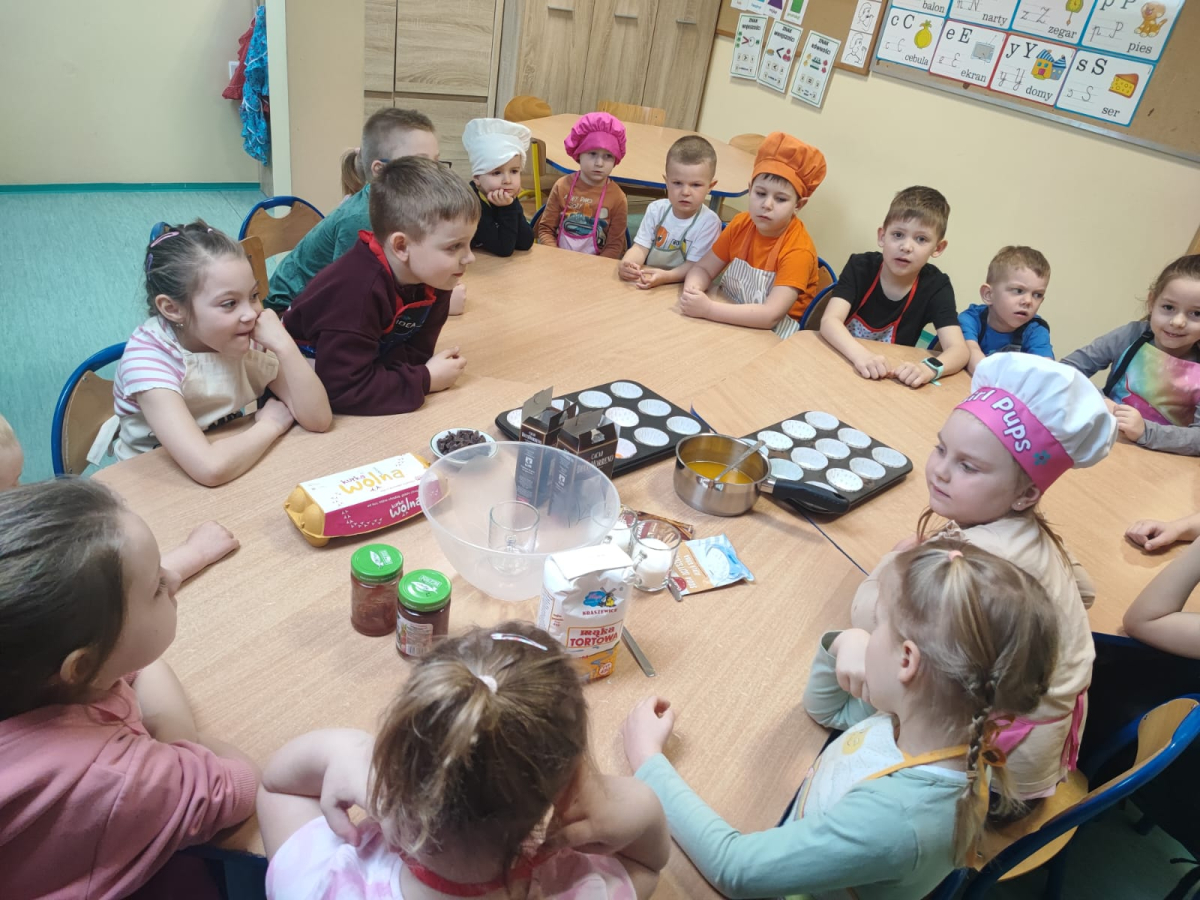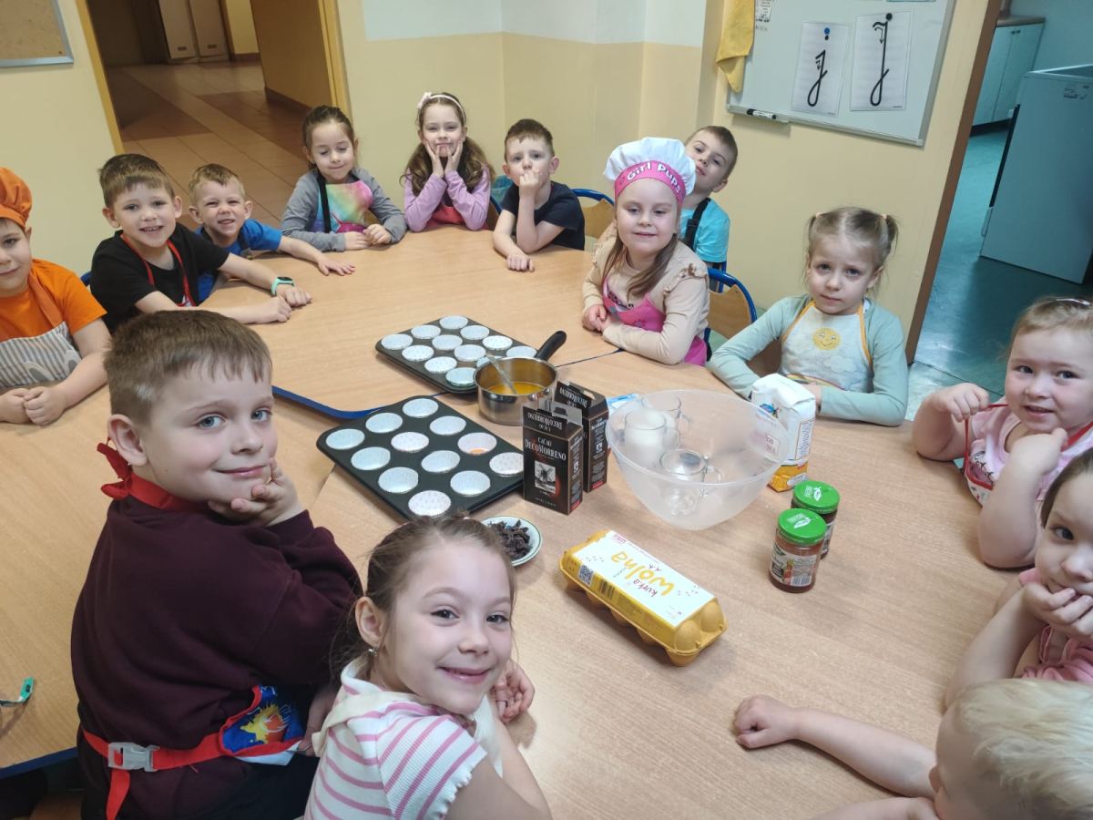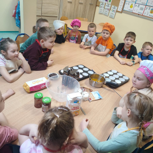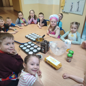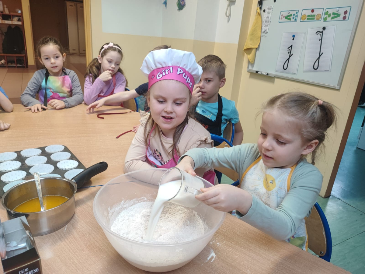 Przedszkolaki dzisiejszy dzień spędziły bardzo pracowicie, postanowiły upiec coś słodkiego. Tym razem były to babeczki. Na początku zajęć dzieci rozpoznawały i nazywały przygotowane produkty potrzebne do wykonania muffinek, omawiały przybory wykorzystywane podczas pieczenia, aż w końcu zabrały się do pracy. Przedszkolaki z wielkim zapałem odmierzały składniki na ciasto, mieszały je i nakładały do foremek. Zapach piekących się babeczek wypełnił całe przedszkole. Po kilku minutach ujrzały swoje pachnące i ciepłe babeczki. Przedszkolaki świetnie się bawiły i z przyjemnością próbowały swoich wypieków.