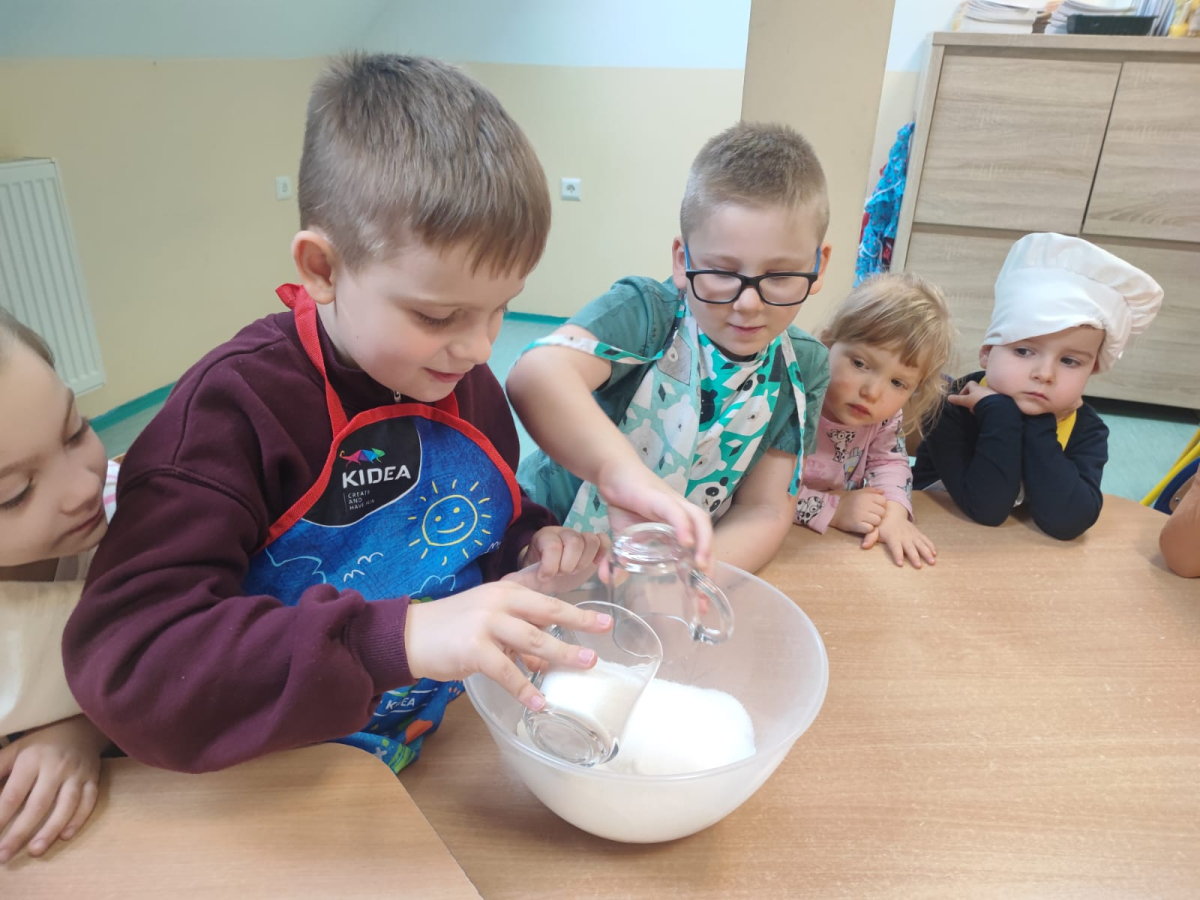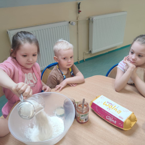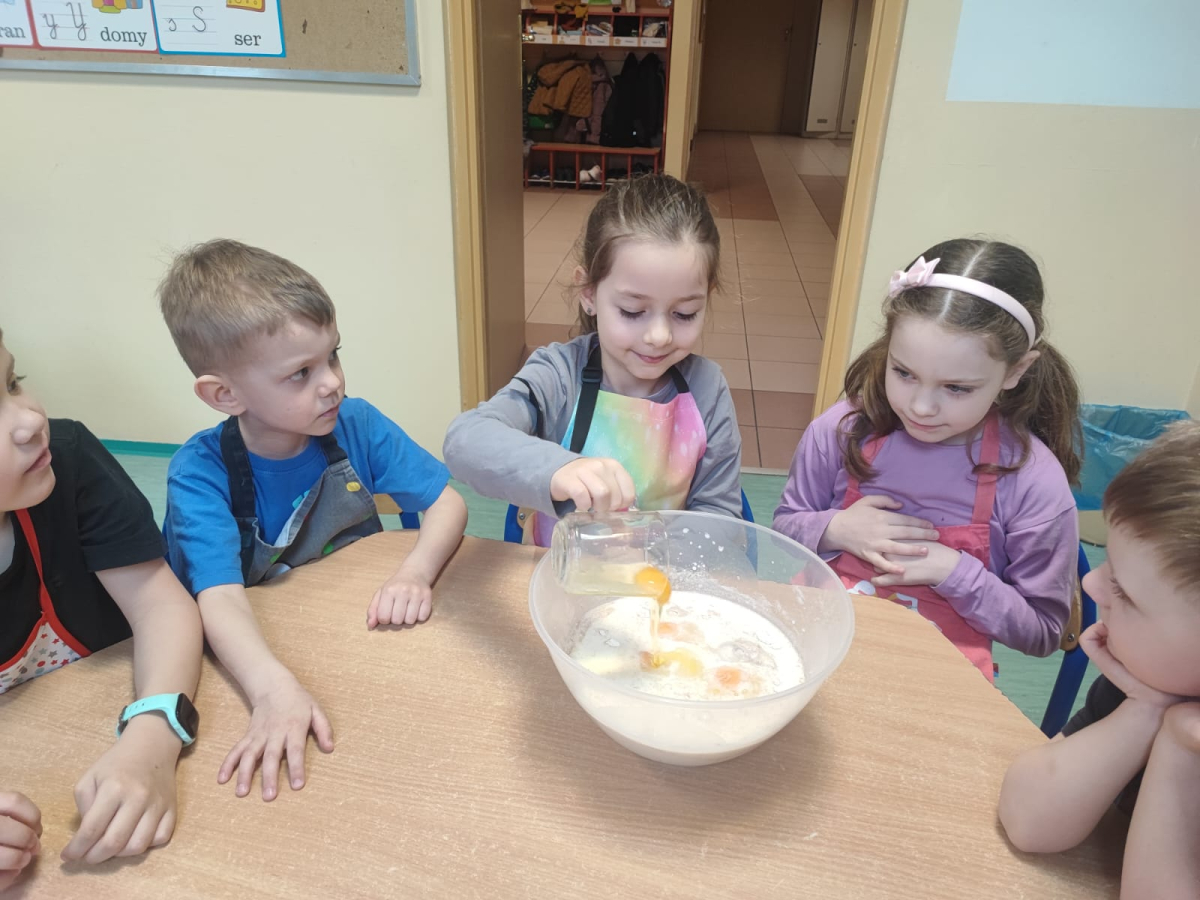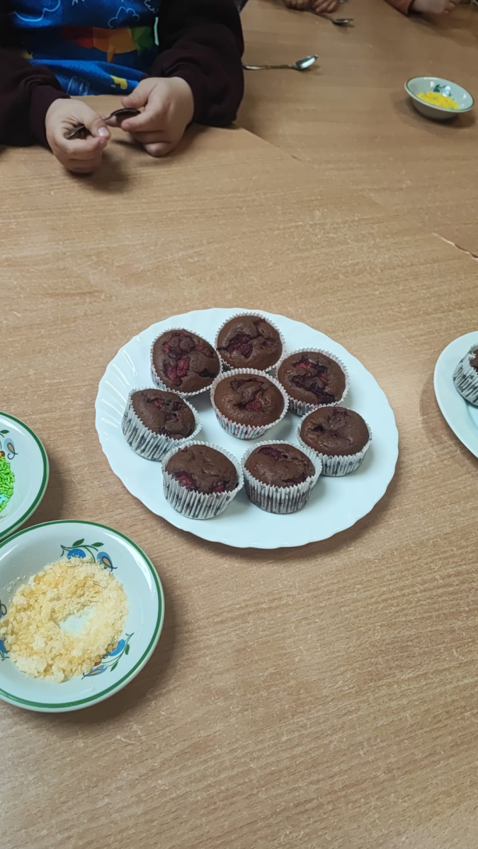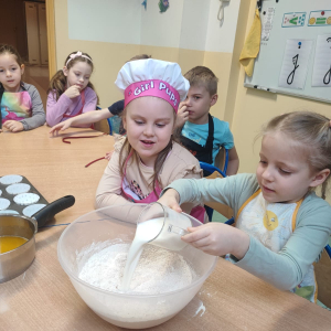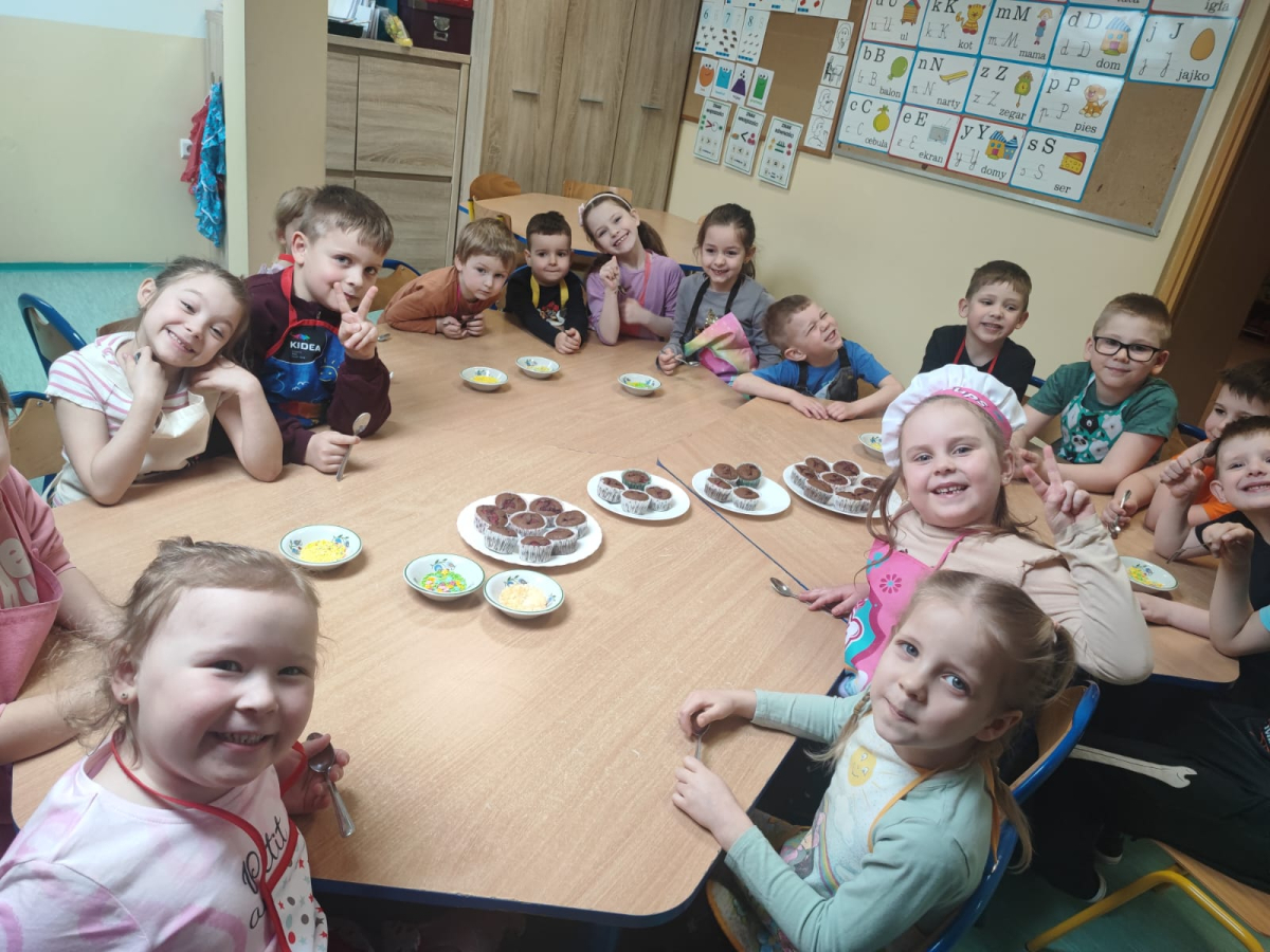 Przedszkolaki dzisiejszy dzień spędziły bardzo pracowicie, postanowiły upiec coś słodkiego. Tym razem były to babeczki. Na początku zajęć dzieci rozpoznawały i nazywały przygotowane produkty potrzebne do wykonania muffinek, omawiały przybory wykorzystywane podczas pieczenia, aż w końcu zabrały się do pracy. Przedszkolaki z wielkim zapałem odmierzały składniki na ciasto, mieszały je i nakładały do foremek. Zapach piekących się babeczek wypełnił całe przedszkole. Po kilku minutach ujrzały swoje pachnące i ciepłe babeczki. Przedszkolaki świetnie się bawiły i z przyjemnością próbowały swoich wypieków.