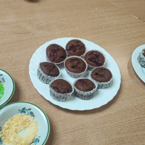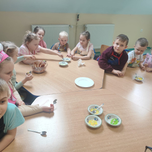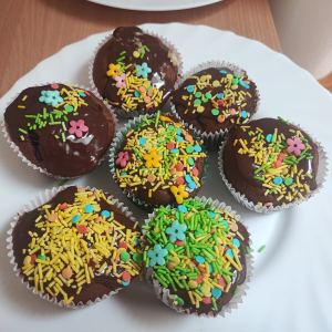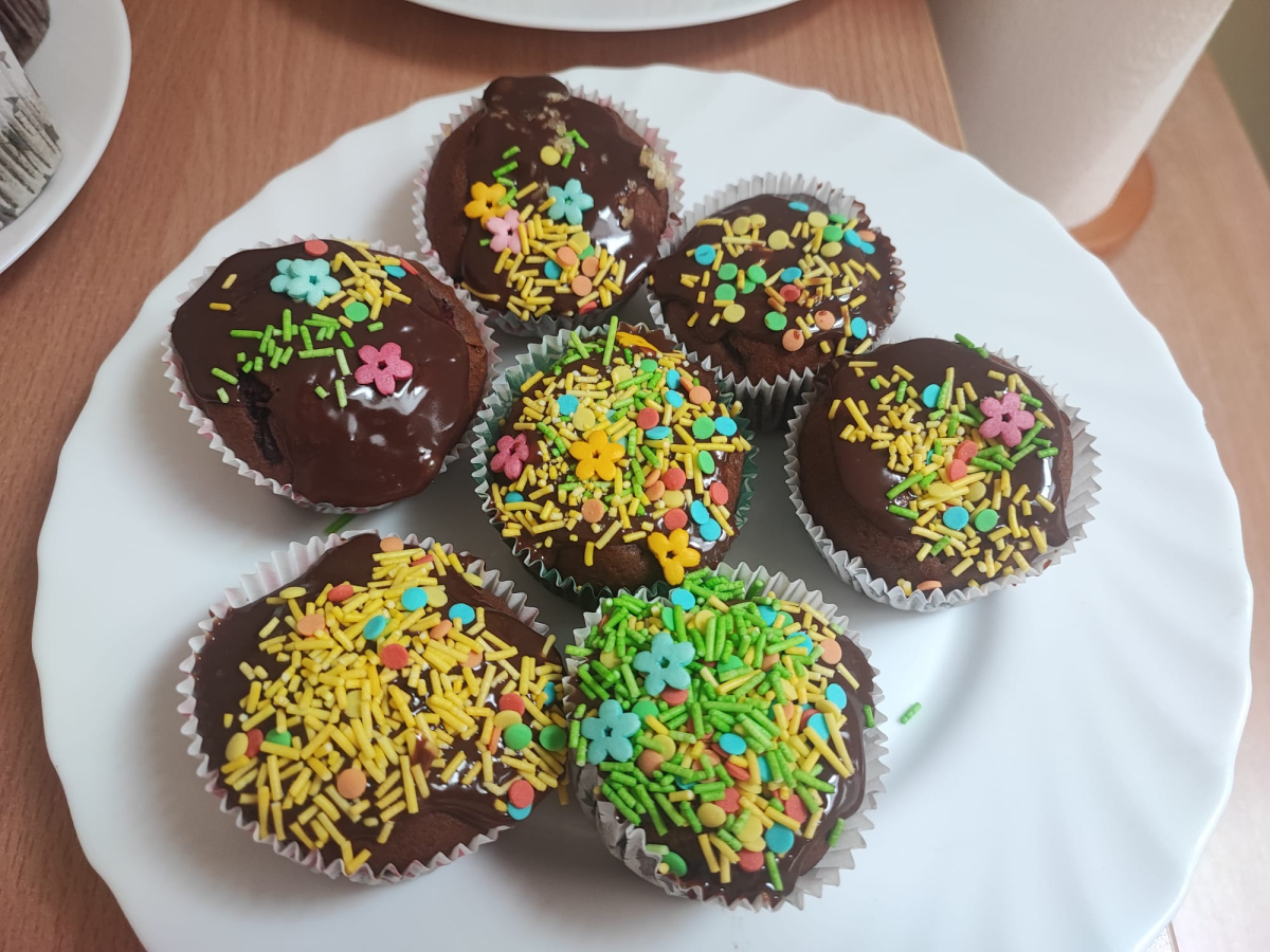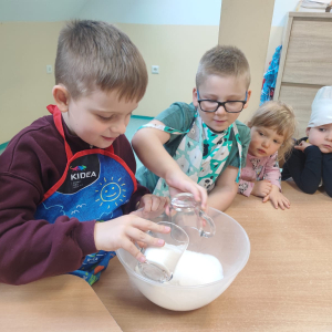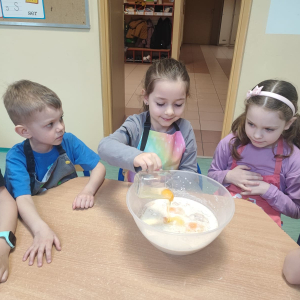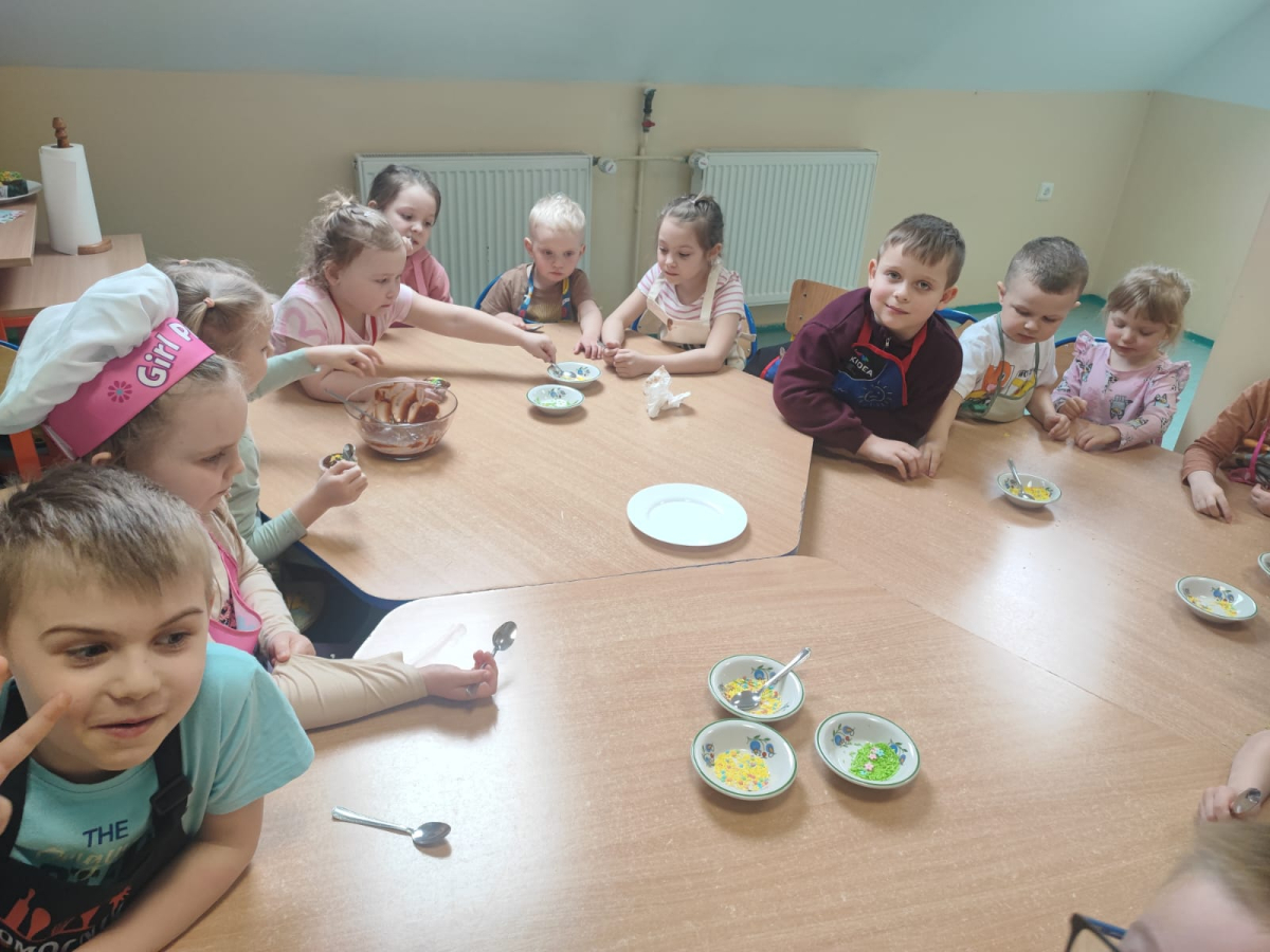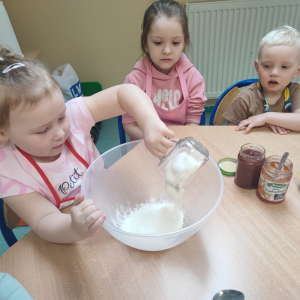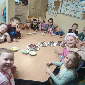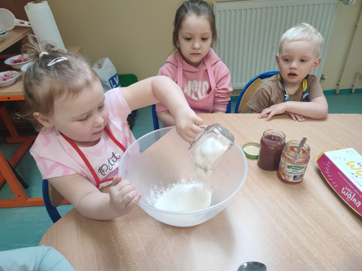 Przedszkolaki dzisiejszy dzień spędziły bardzo pracowicie, postanowiły upiec coś słodkiego. Tym razem były to babeczki. Na początku zajęć dzieci rozpoznawały i nazywały przygotowane produkty potrzebne do wykonania muffinek, omawiały przybory wykorzystywane podczas pieczenia, aż w końcu zabrały się do pracy. Przedszkolaki z wielkim zapałem odmierzały składniki na ciasto, mieszały je i nakładały do foremek. Zapach piekących się babeczek wypełnił całe przedszkole. Po kilku minutach ujrzały swoje pachnące i ciepłe babeczki. Przedszkolaki świetnie się bawiły i z przyjemnością próbowały swoich wypieków.
