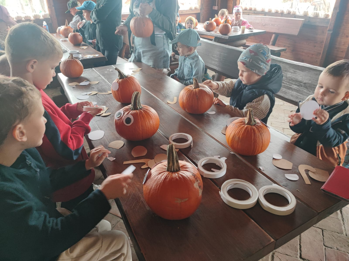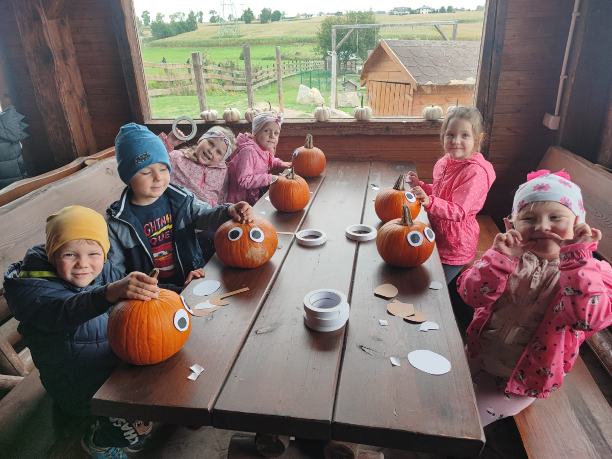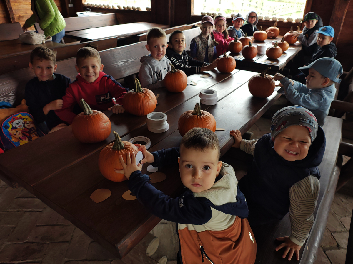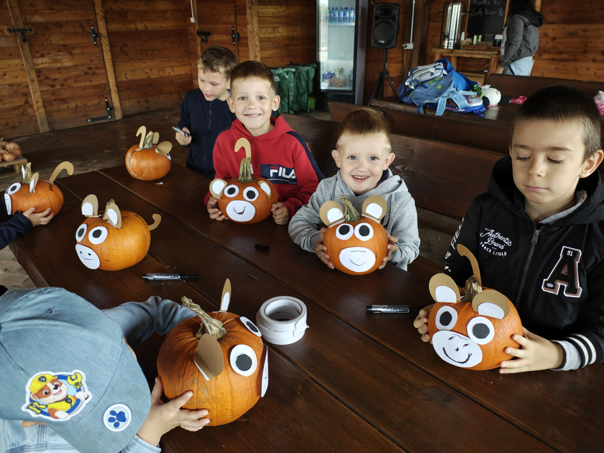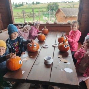 Przedszkolaki chętnie uczestniczyły w warsztatach dyniowych podczas, których wykonały z dyni małpki, następnie karmiliśmy alpaki, kozy, osiołki, króliki oraz odwiedziliśmy małpkę i szopy. Było również ognisko oraz zabawy na placu zabaw. Wróciliśmy zmęczeni, ale szczęśliwi.